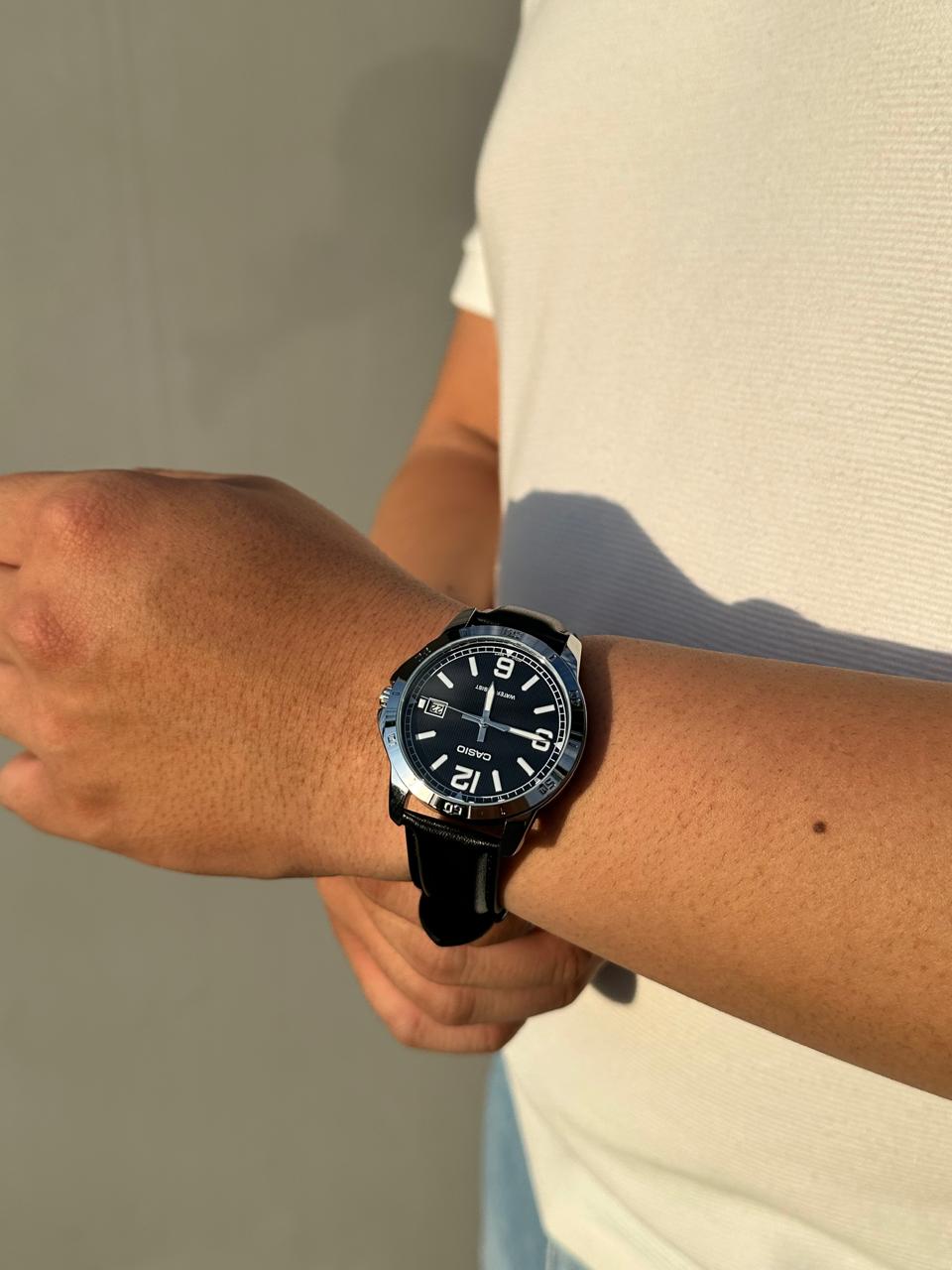Reloj analógico con correa de cuero negro y detalles plateados, un modelo versátil para ocasiones casuales y formales.